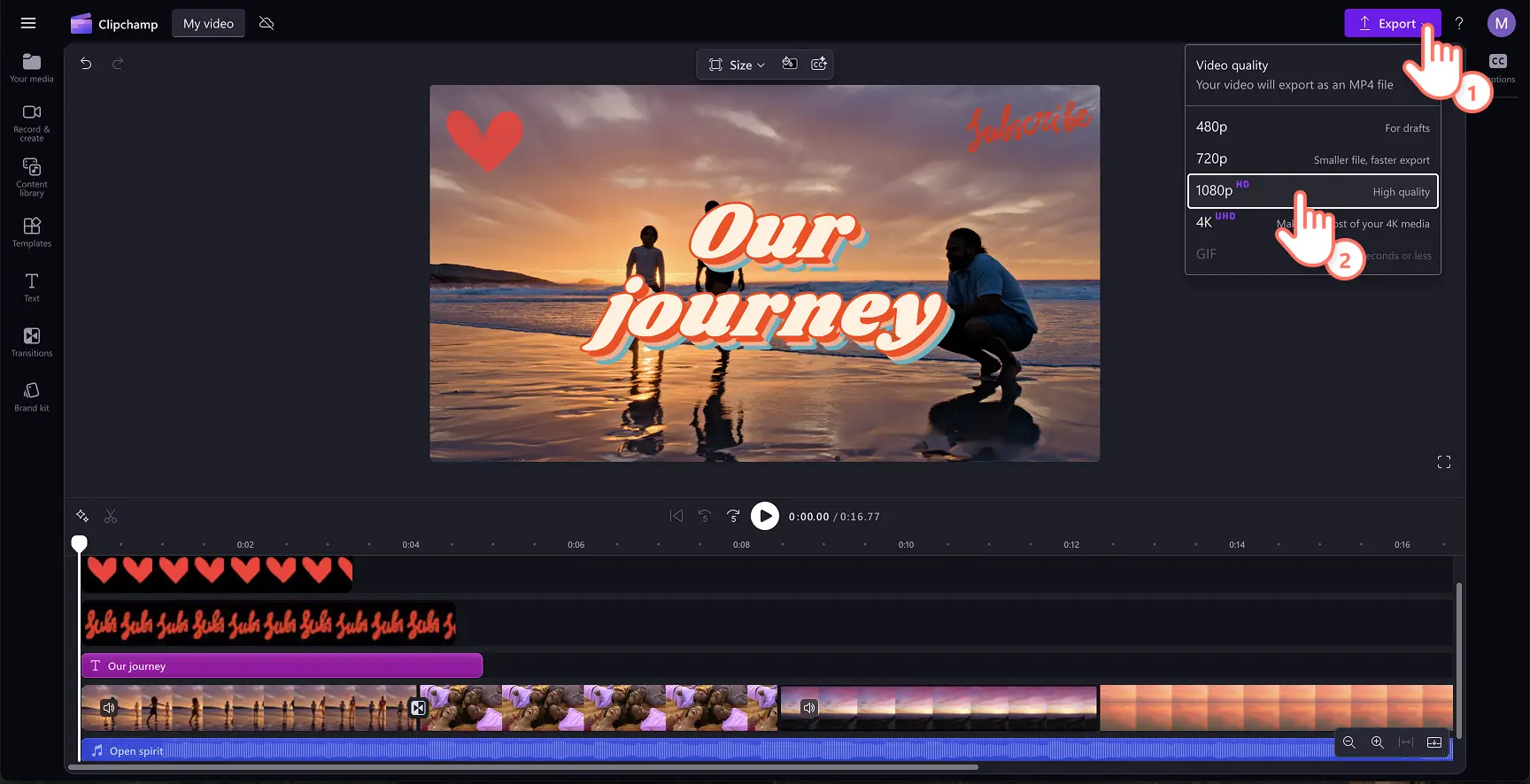 Antes de guardar tu nuevo vídeo, asegúrate de previsualizarlo haciendo clic en el botón Reproducción. Cuando estés listo para guardarlo, haz clic en el botón Exportar y selecciona una resolución de vídeo que se adapte a tus necesidades.También puedes guardar tu video directamente en OneDrive.