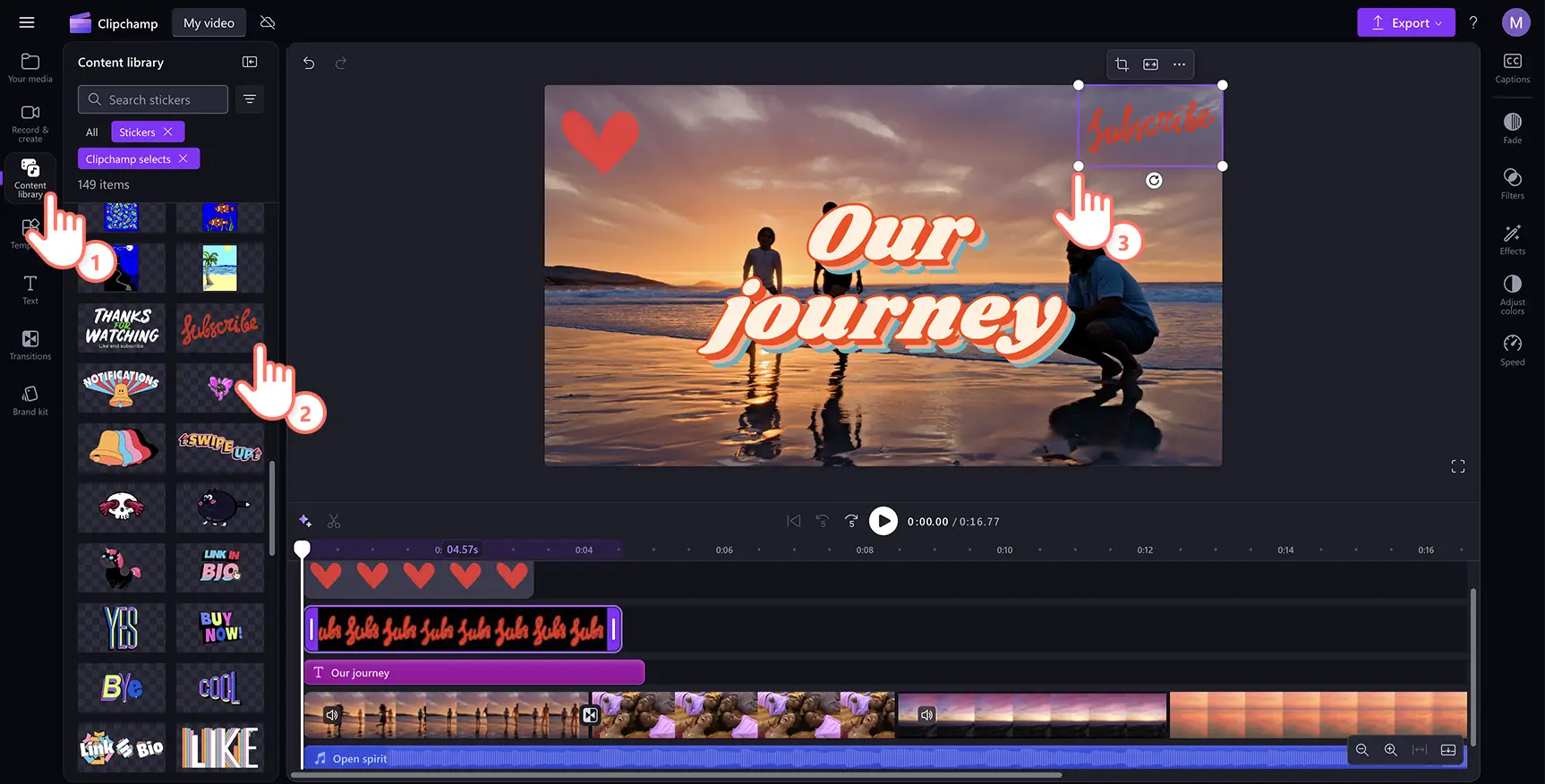Para agregar gráficos de video como adhesivos y formas, haz clic en la pestaña de la biblioteca de contenido en la barra de herramientas y luego haz clic en la opción desplegable para seleccionar adhesivos. Navega por la biblioteca de adhesivos y, a continuación, arrastra y coloca un adhesivo en la línea de tiempo sobre tus vídeos. Selecciona el recurso de video y redimensiona y recorta libremente utilizando los controles de recorte que aparecen en la vista previa del video.Encuentra una variedad de gráficos animados para complementar el mensaje de tu video en Clipchamp.