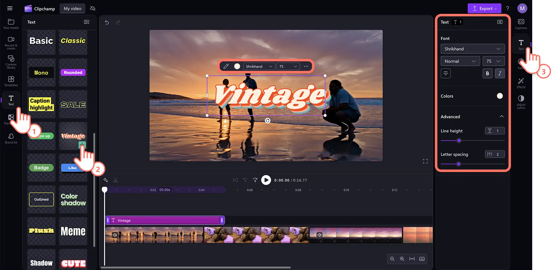 Elige un estilo de texto que coincida con el estado de ánimo de tu contenido, o carga tu fuente personalizada para crear un video de presentación de marca.