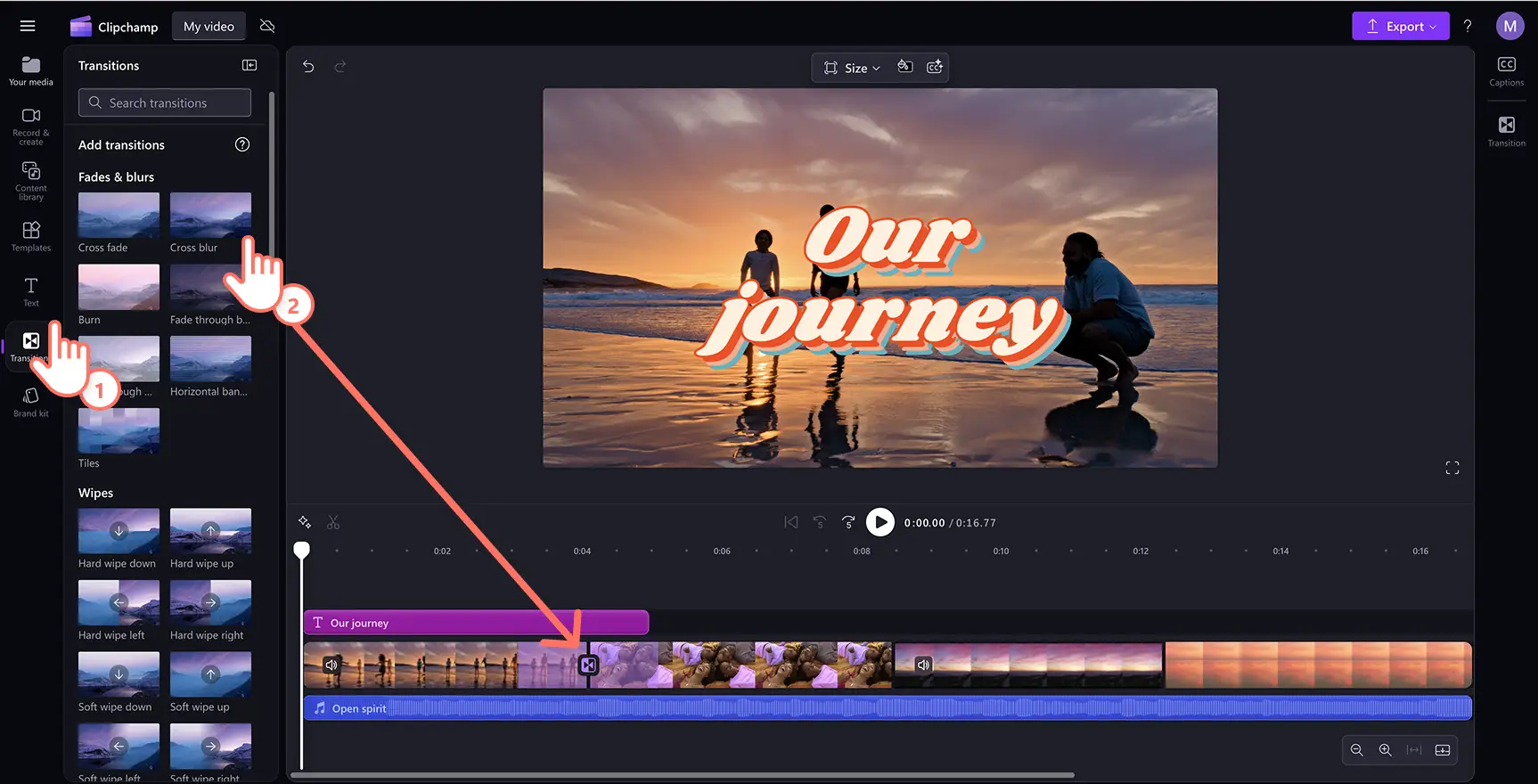Coloca una transición de escena entre dos clips en la línea de tiempo para mejorar el flujo de tu video. Haz clic en la pestaña de transiciones de la barra de herramientas. Arrastra y coloca una transición en la línea de tiempo entre dos recursos multimedia.